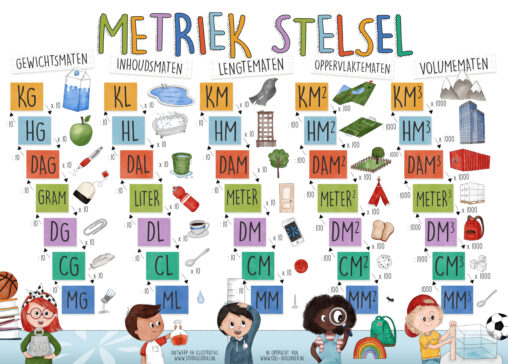In samenwerking met o.b.s. de Klinker in Oud-Beijerland heb ik een poster getekend waarin het metriekstelsel op een speelse manier wordt uitgelegd.